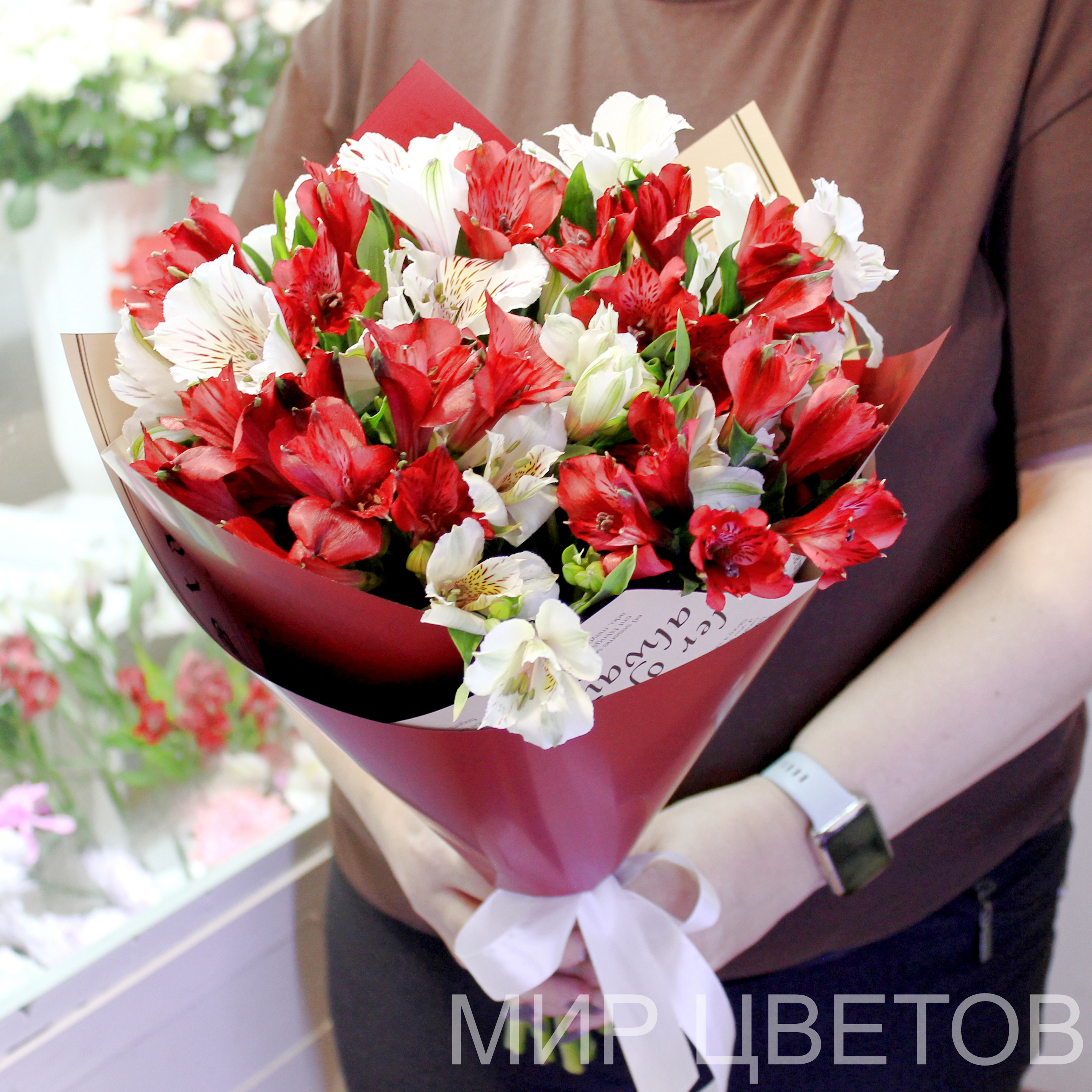 Букет из ярко-красных и белых альстромерий напоминает восход солнца. На который хочется и хочется любоваься.