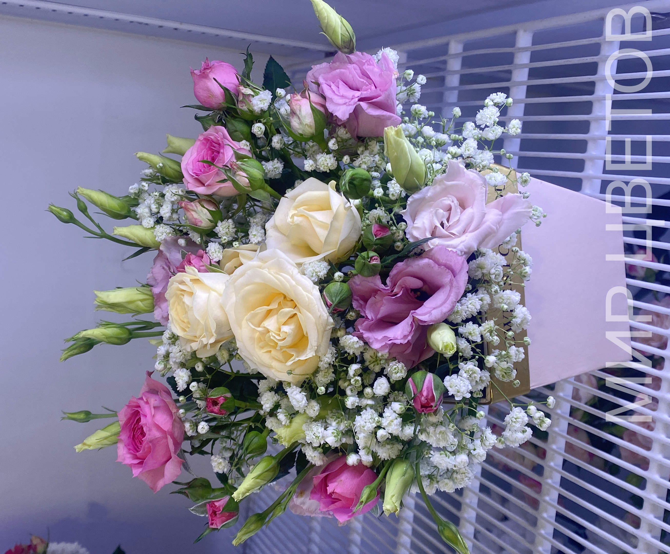 Роза кустовая, лизиантус, листья рускуса, гипсофила