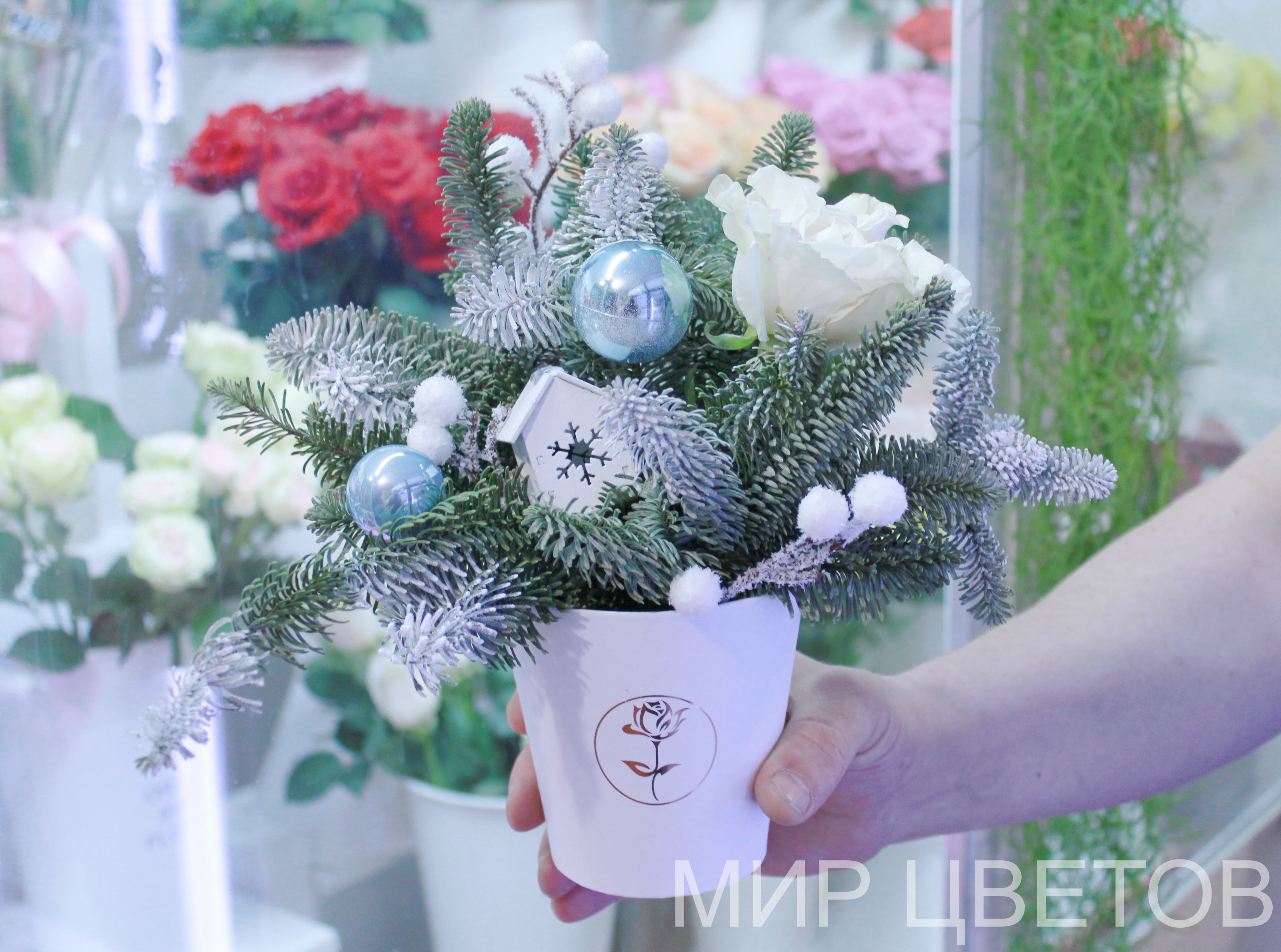 Веточки Нобилиса, новогодний декор, роза Коттон Экспрешн свежая, цветочная коробочка