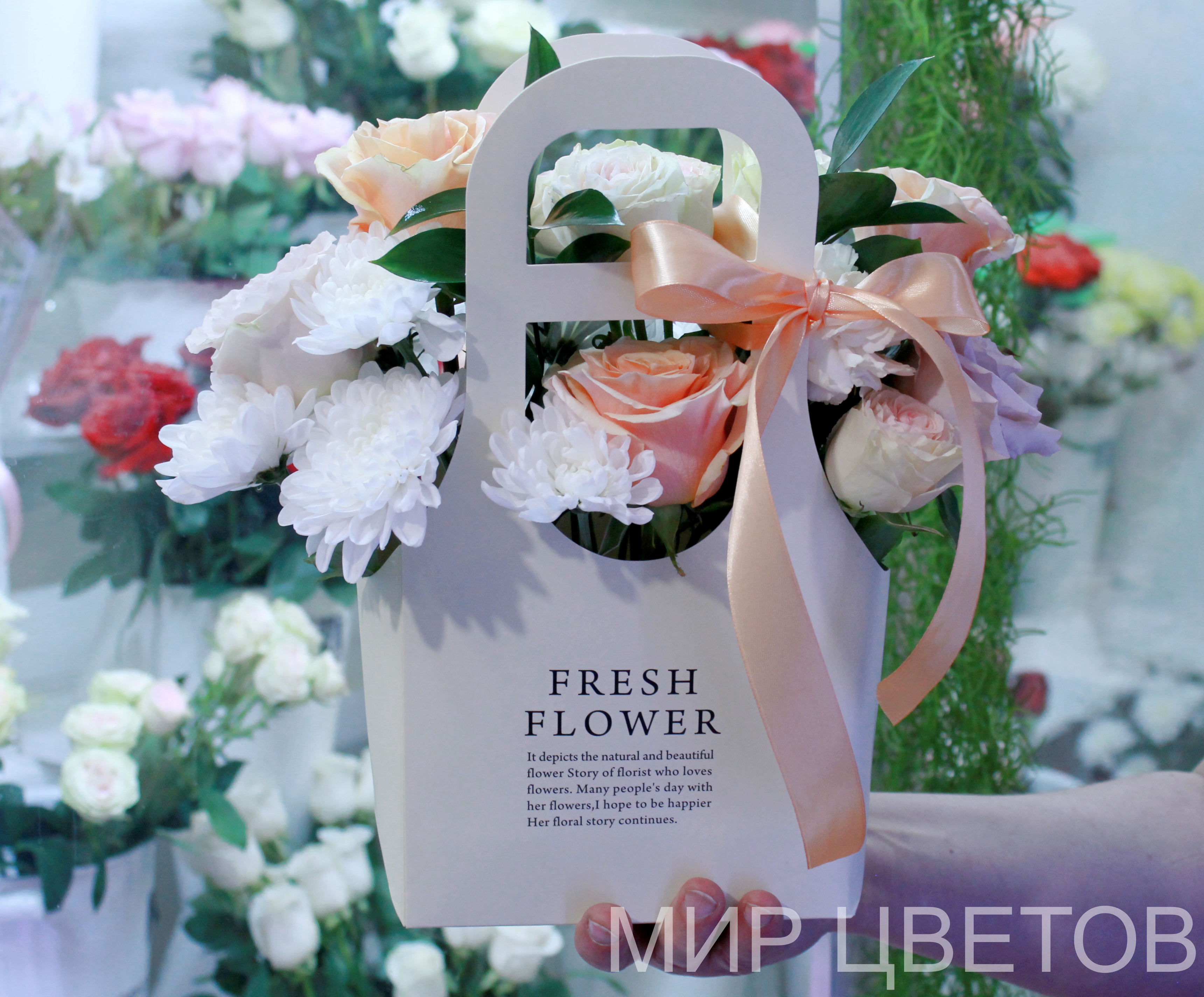 Роза Квиксенд, роза Феникс, гвоздика, хризантема кустовая белая, роза кустовая бело-розовая, цветочная сумочка, лента