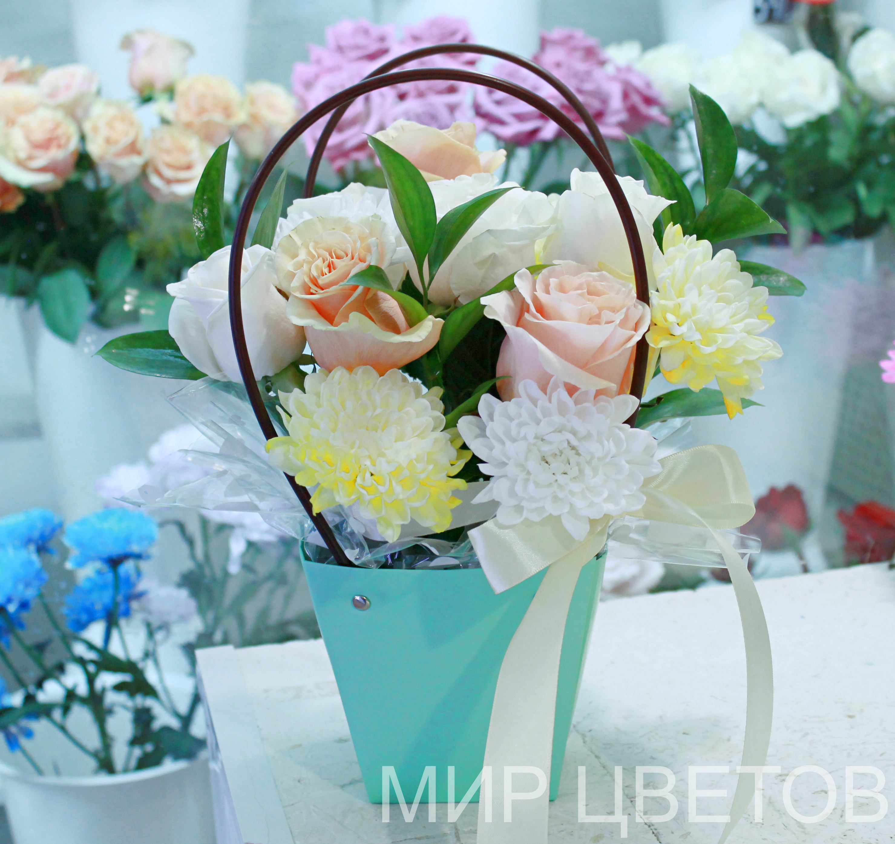Роза Феникс, Роза Мондиаль, Роза Вендела, хризантема кустовая, листья рускуса, цветочный пакет подарочный, лента